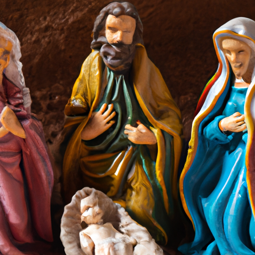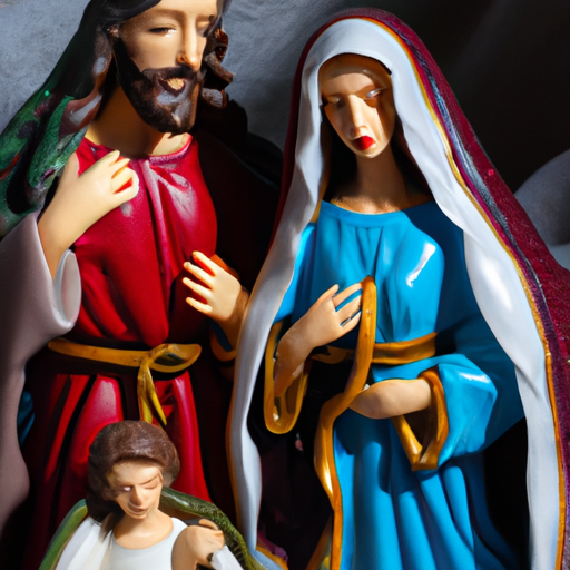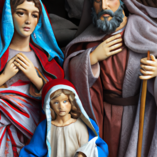 "The Holy Family in biblical setting, Joseph with brown beard wearing traditional robe and cloa